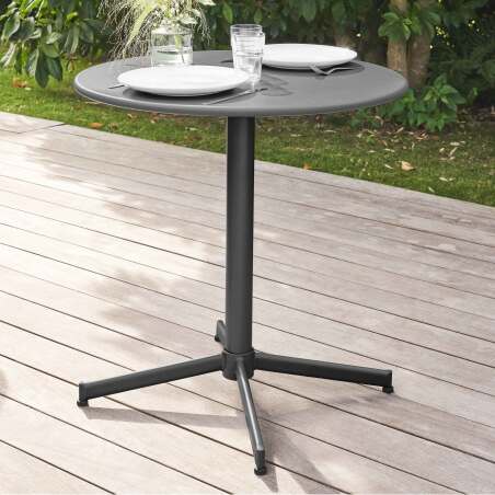 La table de jardin bistrot ronde PALAVAS allie design moderne et fonctionnalité, idéale pour les professionnels souhaitant optimiser leur espace extérieur. Avec un diamètre de 70 cm, elle accueille 2 à 4 convives et son plateau rond rabattable facilite le rangement tout en limitant l’encombrement. Le mécanisme simple à poignée permet d’incliner et de bloquer le plateau en toute facilité. Fabriquée en acier thermolaqué avec peinture époxy, elle repose sur un pied central stable avec 4 patins réglables pour assurer une bonne stabilité même sur sols irréguliers. Pratique et élégante, elle se monte en seulement 3 minutes, visserie et notice incluses.